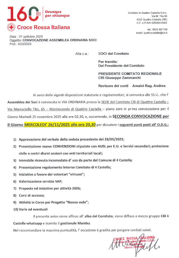 Durante la cerimonia il Sindaco di Quattro Castella Alberto Olmi annuncerà la firma della CONVENZIONE che ASSEGNA al nostro Comitato le ATTIVITA’ DI PROTEZIONE CIVILE COMUNALI e soprattutto il TANTO ATTESO AVVIO DEL PERCORSO CHE PORTERA’ ALLA PROGETTAZIONE DELLA NUOVA SEDE del nostro Comitato.
